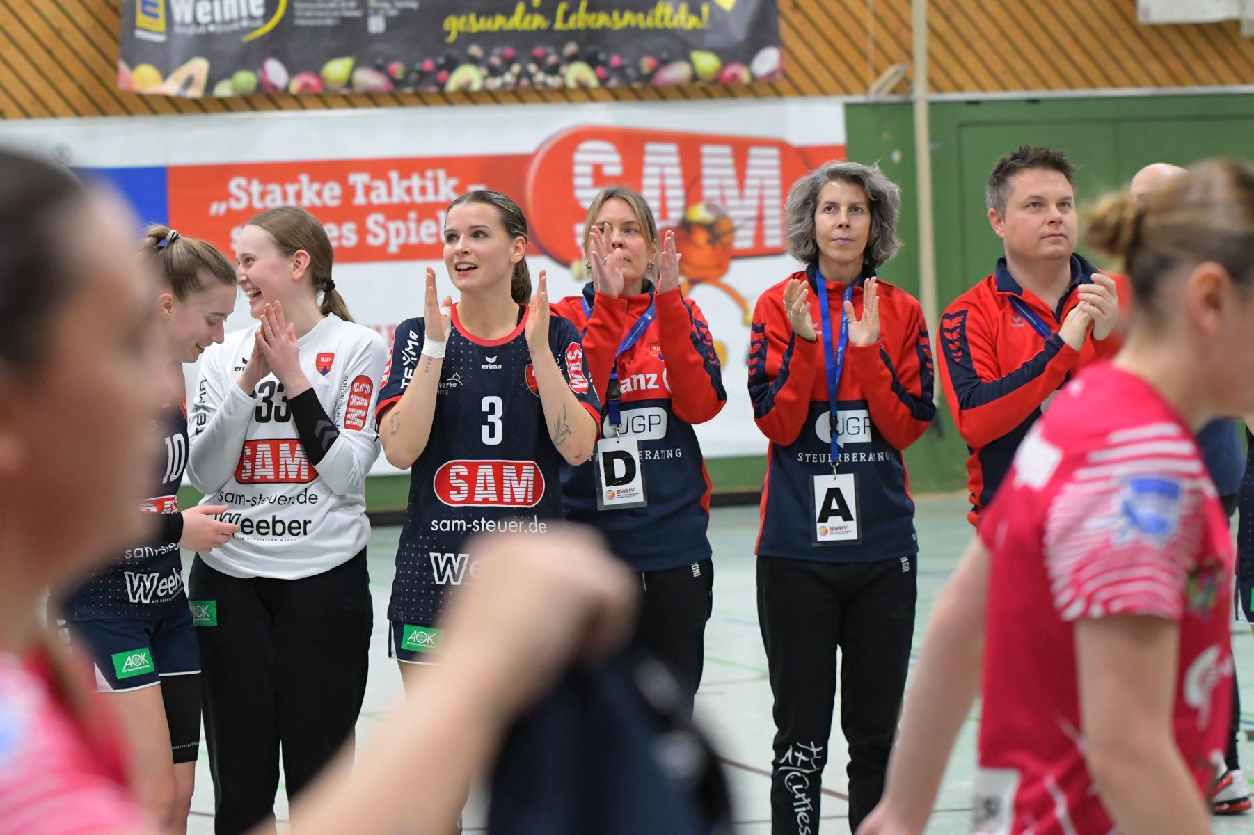 Auch nach der Pause hielten die Gäste noch eine Weile mit. Beim 25:22 in der 42. Minute sah es sogar danach, als dass der TSV noch einmal entscheidend eingreifen könnte. Doch trotz aller gesundheitlichen Probleme konnten die H2Ku-Frauen noch einmal zulegen und stellten zehn Minuten später beim 32:24 die zwei Punkte praktisch sicher. Freude kam dennoch nicht auf, weil kurz danach Sofia Brand bei einem eigentlich eher harmlosen Zweikampf so auf dem Hallenboden aufkam, dass sie unter starken Schmerzen in den Katakomben der Halle behandelt werden mussten. So gingen des öfteren die besorgten Blicke der Spielerinnen und dem Trainerteam von der Bank eher nach hinten zur Herrenberger Rückraumspielerin. Erst als Sofia Brand kurz vor Ende wieder zur Mannschaft zurückkehren konnte, war auch der Mannschaft zum Feiern zumute. Diese entlud sich dann nach dem Schlusspfiff und dem 36:30.